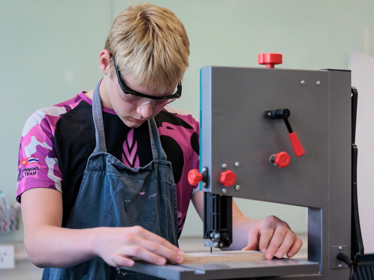 Phòng Công nghệ và Thiết kế (Technology Design) như một xưởng kỹ thuật. Không gian mở với các bàn làm việc gỗ chắc chắn, xung quanh là hệ thống giá treo, tủ dụng cụ được sắp xếp khoa học, cùng khu vực thiết bị chuyên dụng như máy cưa, máy gia công và máy in 3D.