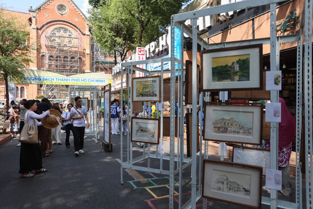Sáng 4/4, triển lãm 50 Spaces: Hà Nội - Huế - Sài Gòn diễn ra tại đường sách Nguyễn Văn Bình, trưng bày 32 tranh về đời sống, danh thắng của ba thành phố.