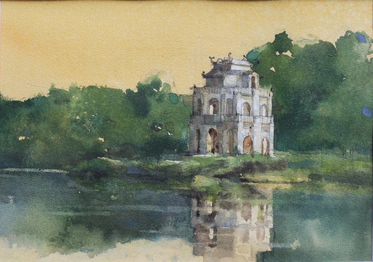 Tranh màu nước của Đặng Phước Tuệ vẽ một góc Hồ Gươm cùng Tháp Rùa, biểu tượng của thủ đô.
