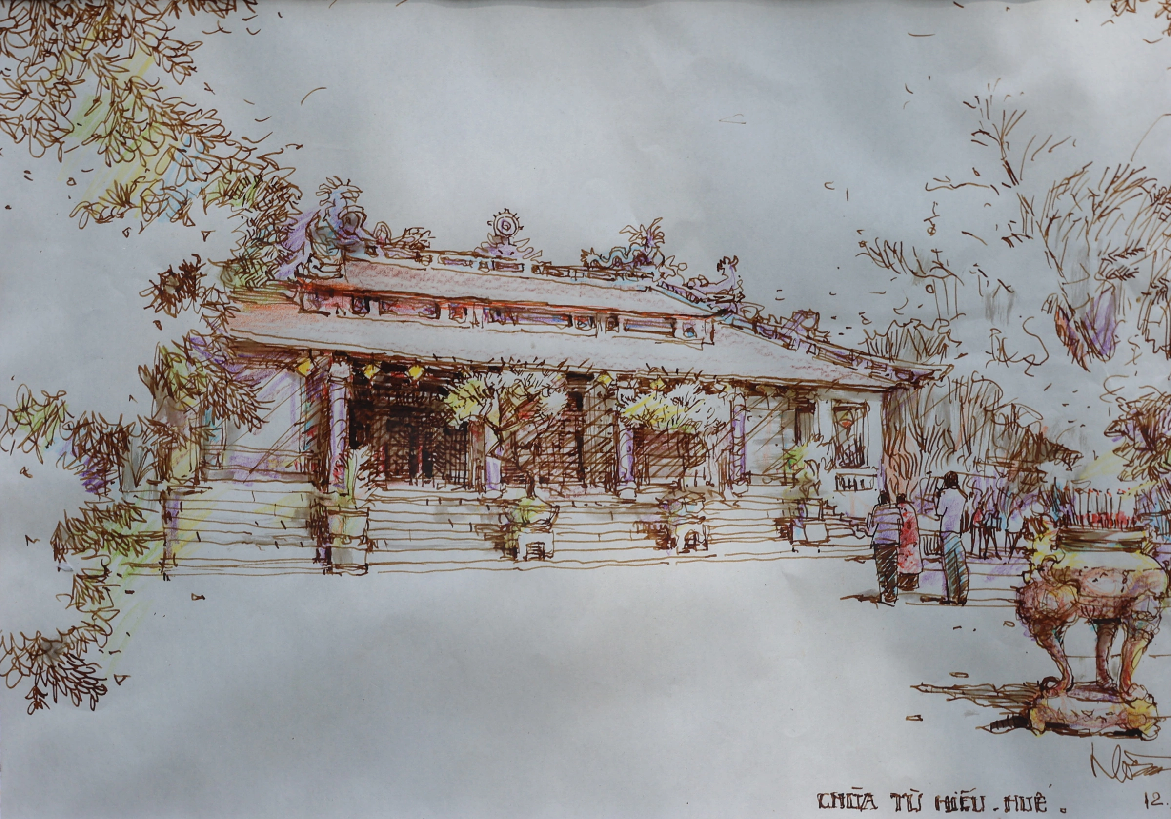 Tác giả Trần Xuân Hồng với bức ký họa chùa Từ Hiếu - ngôi cổ tự nổi tiếng ở Huế, xây dựng năm 1843. "Các di tích của Huế trầm mặc, theo thời gian vẫn đẹp và tinh xảo nên khi vẽ tôi tràn ngập cảm xúc", kiến trúc sư Trần Xuân Hồng cho biết.