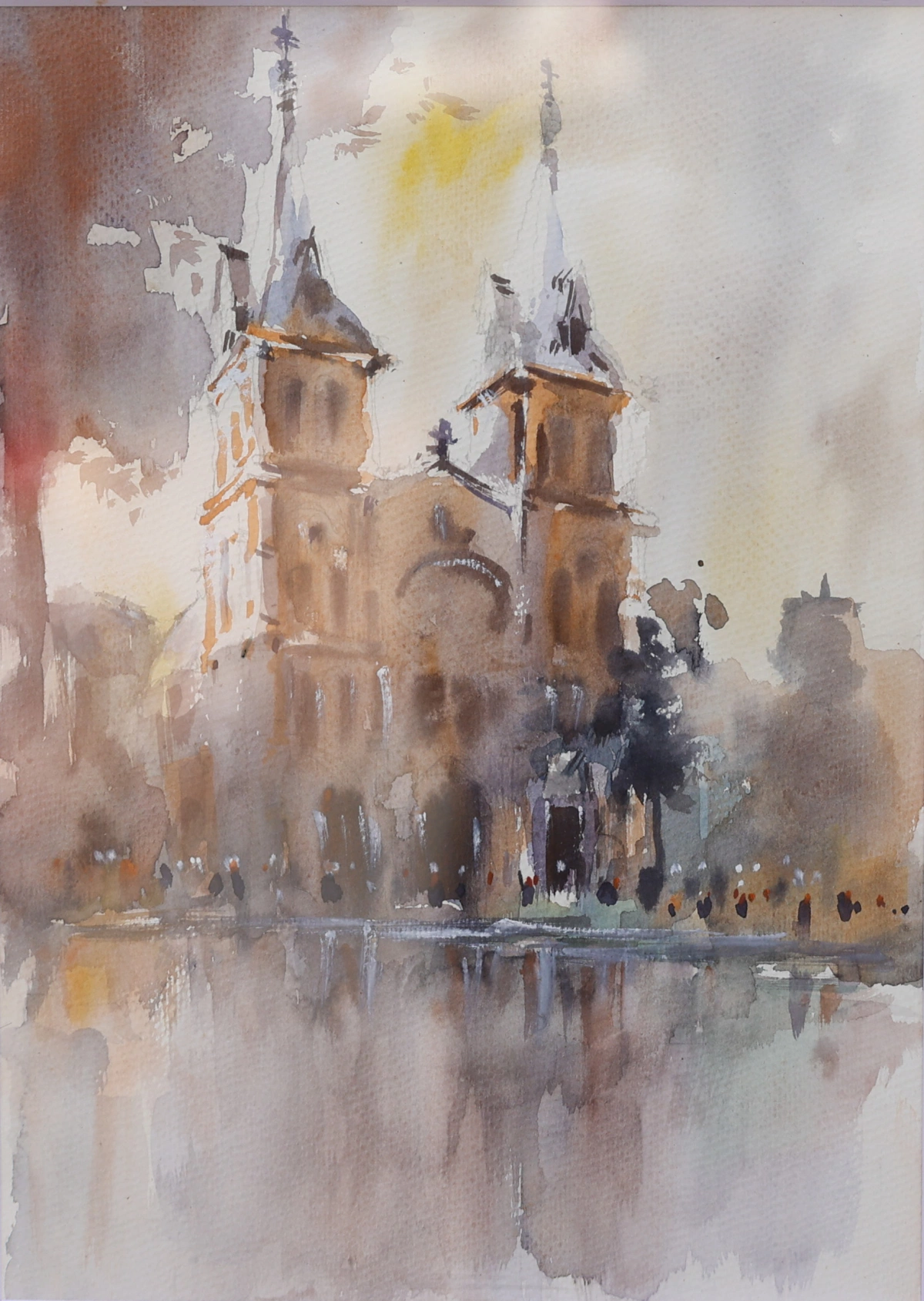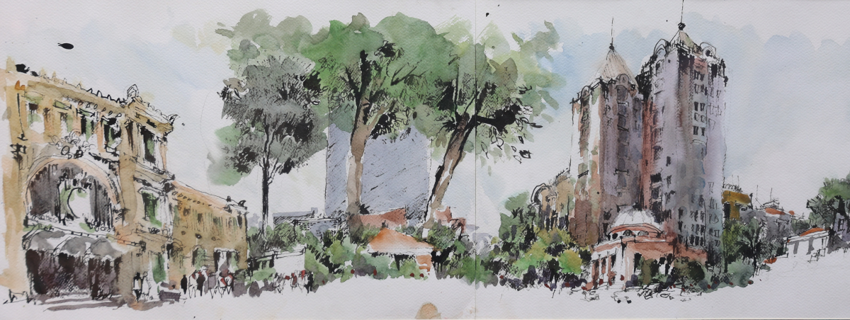 Một góc đường Đồng Khởi, đoạn gần nhà thờ Đức Bà, góc trái là Bưu điện thành phố qua tranh màu nước của Phan Đình Trung.
