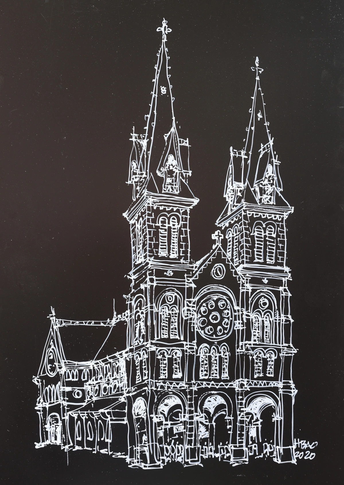 Ba bức vẽ về Nhà thờ Đức Bà của Bùi Hoàng Bảo, Phan Đình Trung và Lam Yên. Trong ảnh là cảnh nhà thờ từ lúc chưa trùng tu đến thời điểm hiện tại.