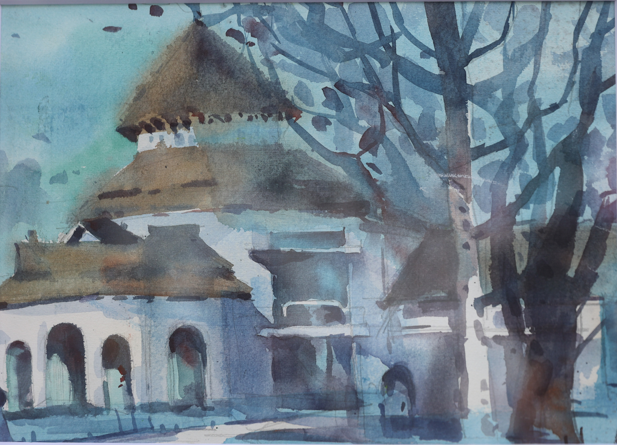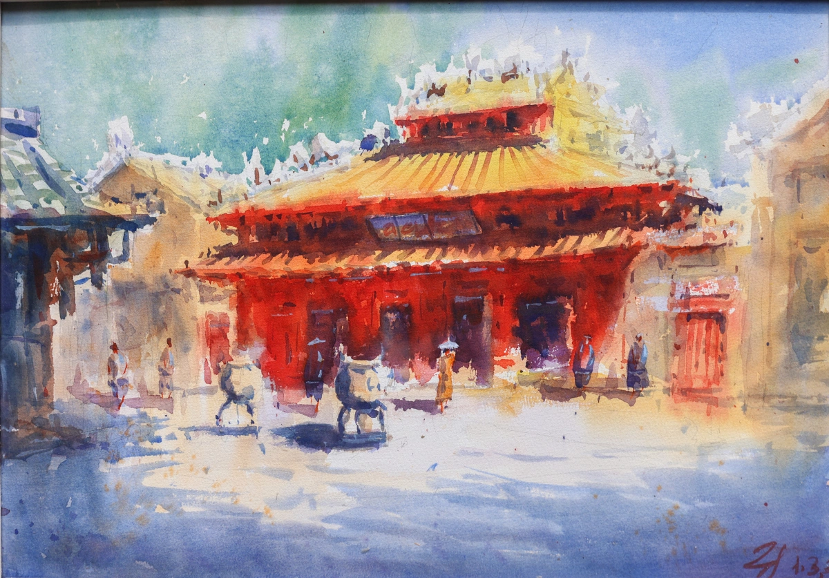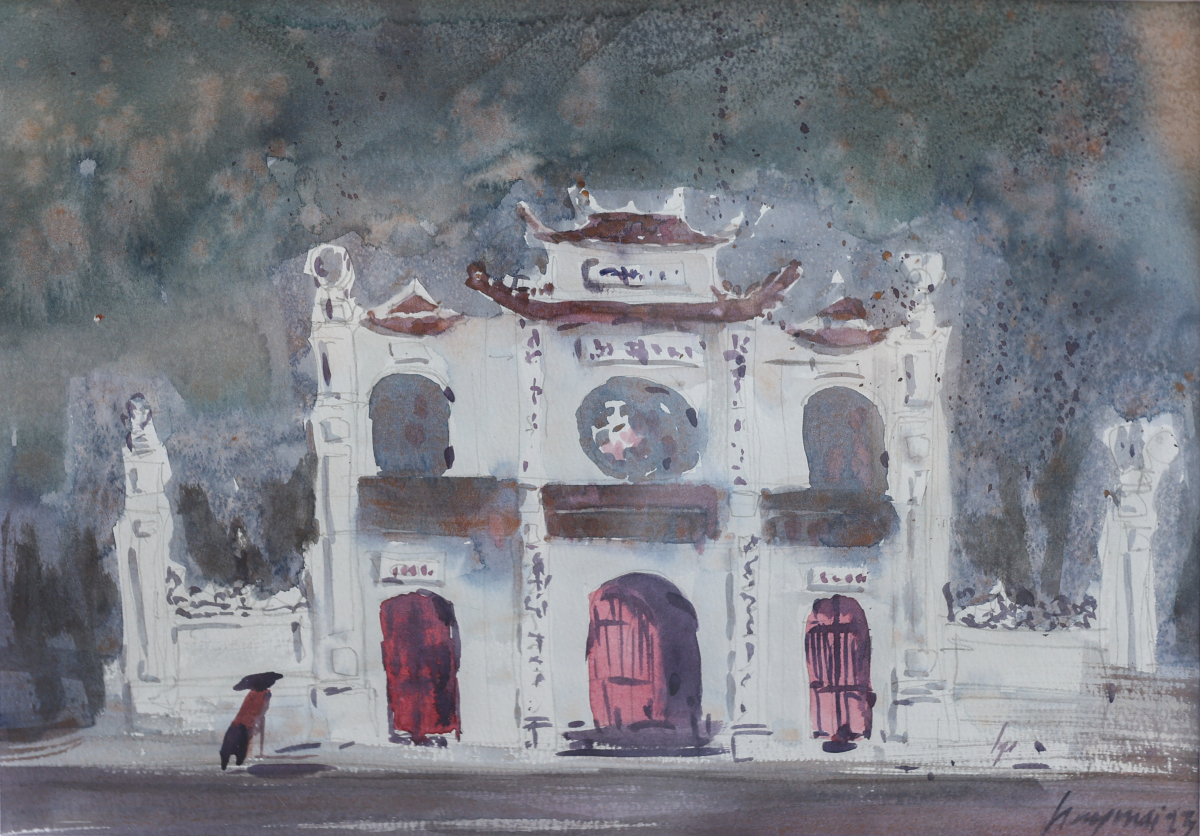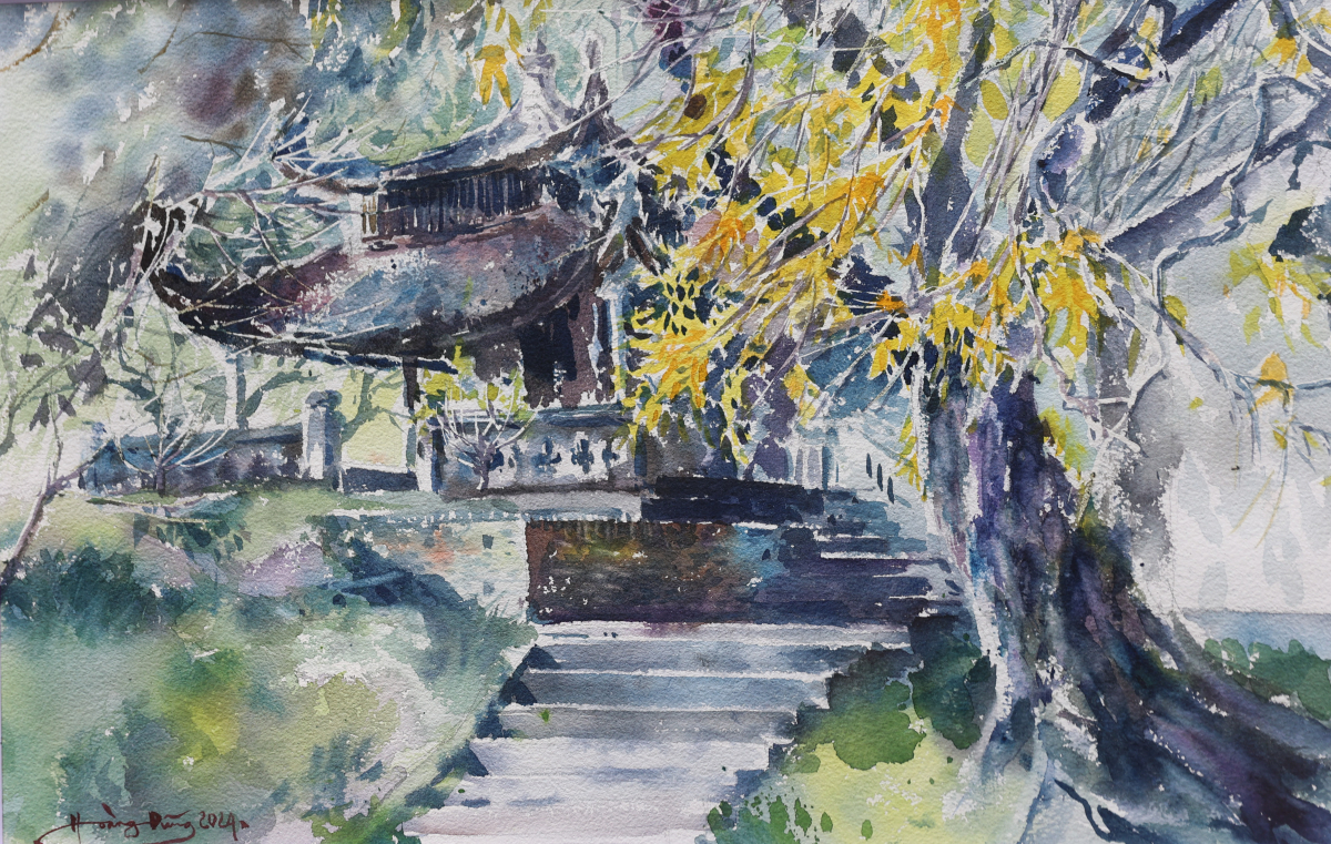 Nét cổ kính của đền Quán Thánh qua tranh màu nước của Phùng Thế Huy. Đền là một trong "Thăng Long tứ trấn" của Hà Nội, xây thời Lý, thờ Huyền Thiên Trấn Vũ, là điểm đến tâm linh quen thuộc của người dân, du khách.