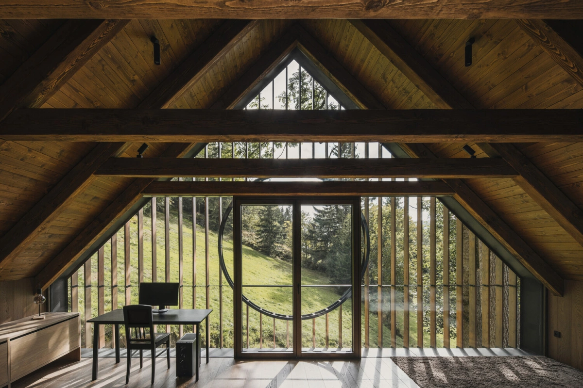 Nhà ở vùng Krkonoše có đặc trưng mái dốc lớn, ô cửa nhỏ nhô ra từ mái để thông gió và lấy sáng cho tầng áp mái, mặt đứng ốp ván gỗ và bố cục ba gian truyền thống. KTS lấy hình mẫu này và làm mới hình ảnh ngôi nhà bằng cách đặt khối mái bất đối xứng lên khung kết cấu gỗ hiện đại, mở rộng thêm khoảng hiên che ngoài trời.