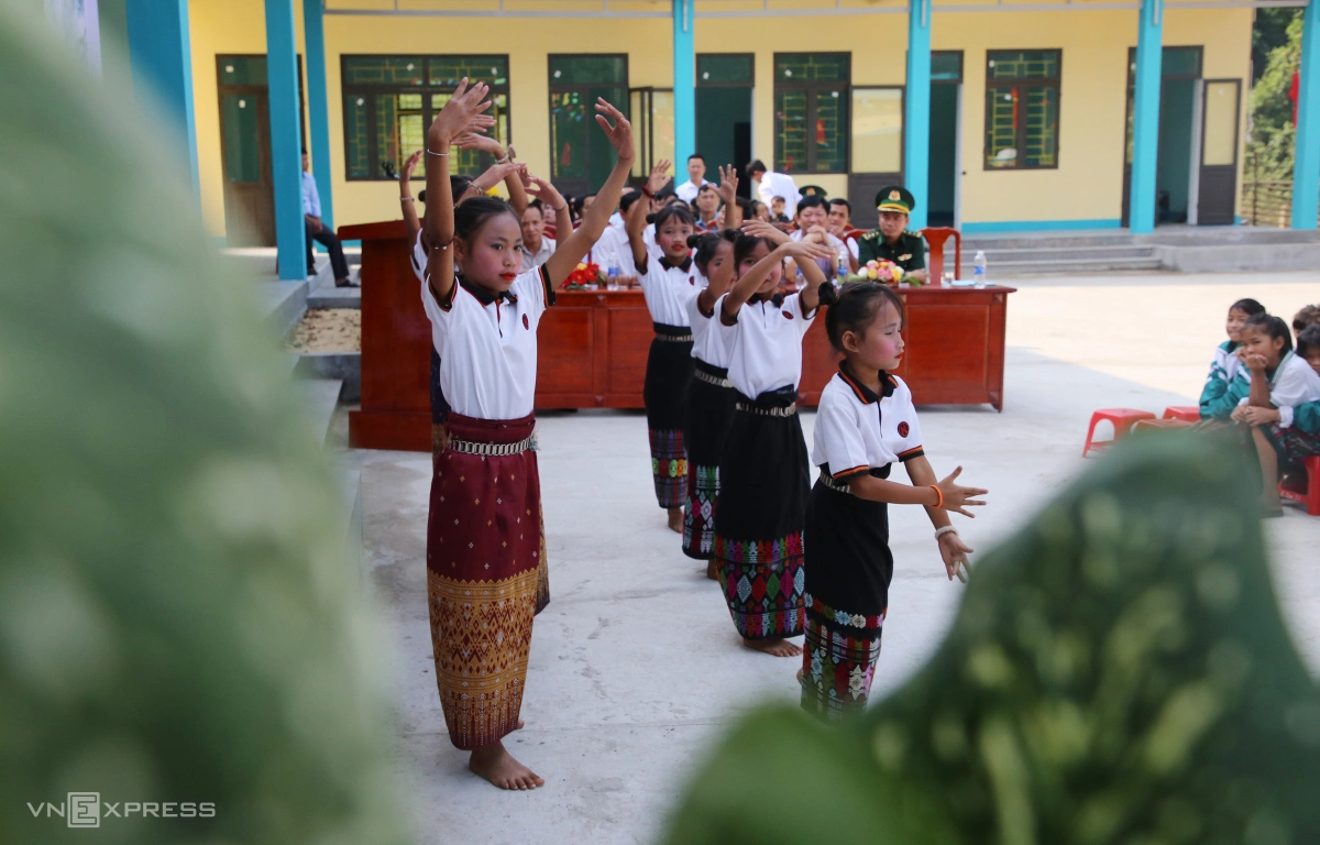 Buổi lễ học sinh điểm trường A Ky tham gia các tiết mục văn nghệ trong ngày vui có trường mới. Học sinh trong trường cũng thích thú, tập trung theo dõi và cổ vũ nhiệt tình cho bạn.
