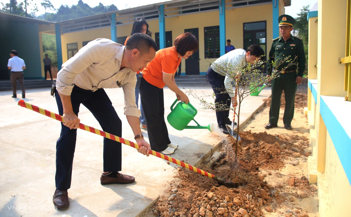 Ông Nguyễn Văn Đại, Phó chủ tịch xã Thượng Trạch (bên trái) cùng đại diện Tập đoàn FPT, Bộ đội Biên phòng đồnCà Roòng trồng cây lưu niệm tại điểm trường A Ky.