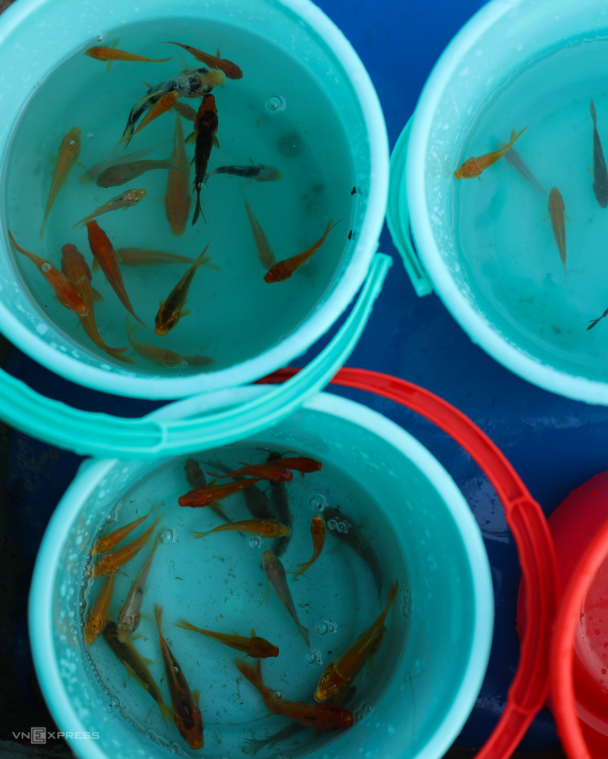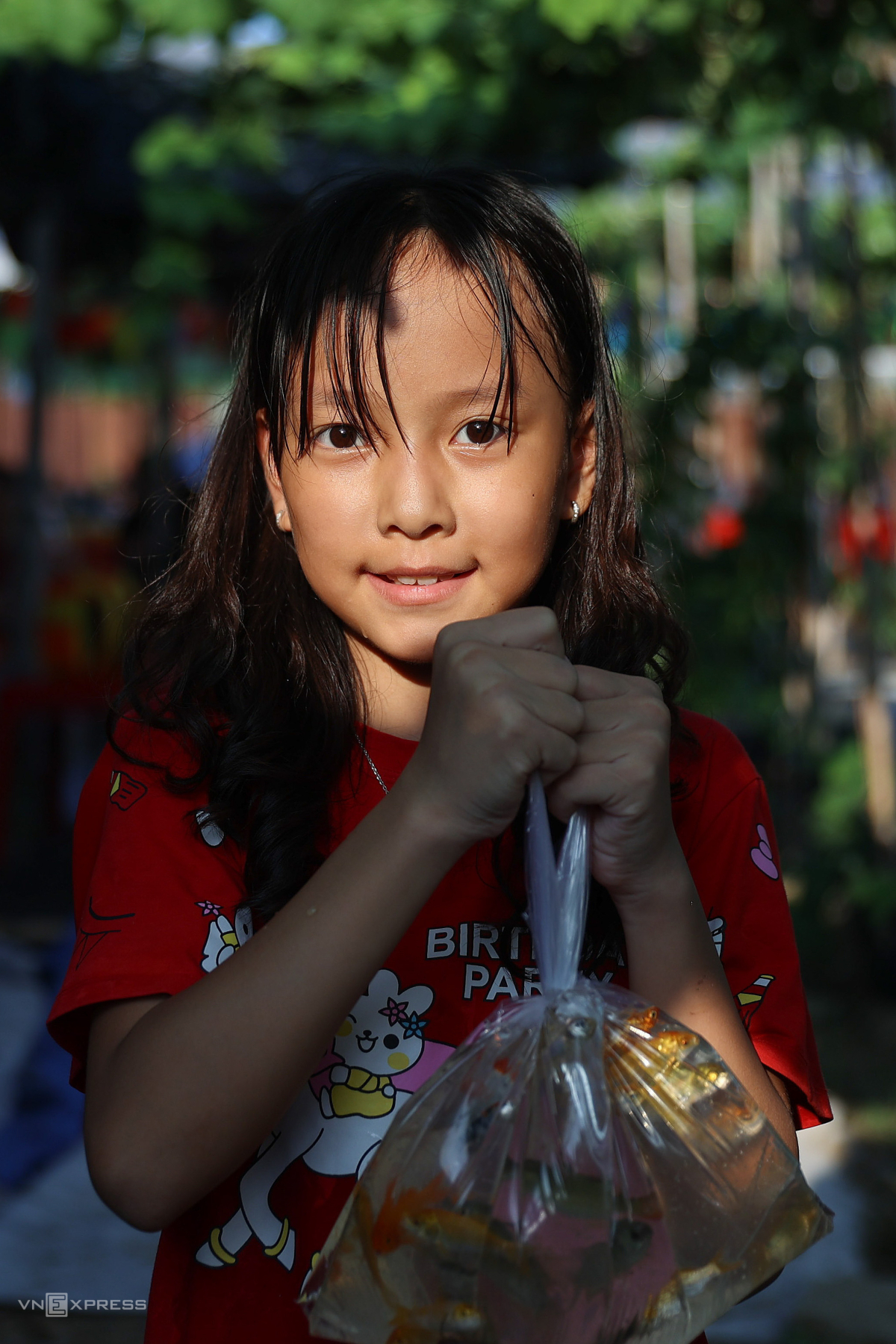 Sau hơn hai tiếng vui chơi, bé Vinh Hoa, 10 tuổi bắt được hàng chục con cá và mang về nhà để nuôi.