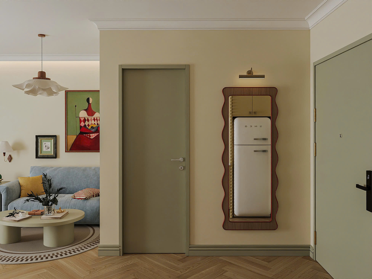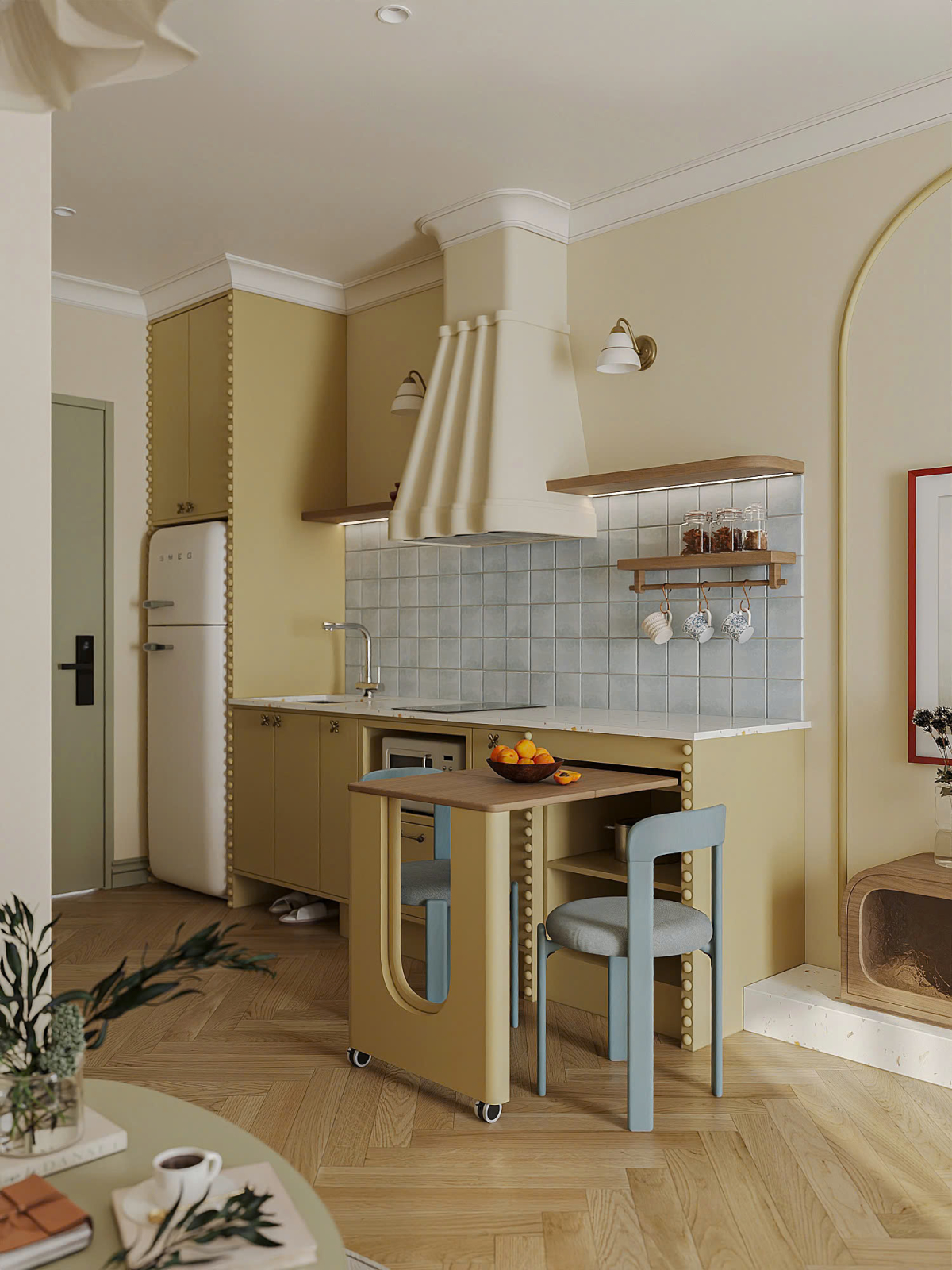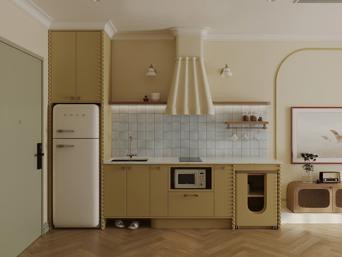 Tủ bếp bố trí dạng chữ I dọc một bên tường, tích hợp tủ lạnh kiểu cổ điển, bếp từ, lò vi sóng và bồn rửa. Chi tiết đinh tán được trang trí chạy dọc viền tủ bếp, tạo nhịp điệu thị giác và gợi phong cách retro.