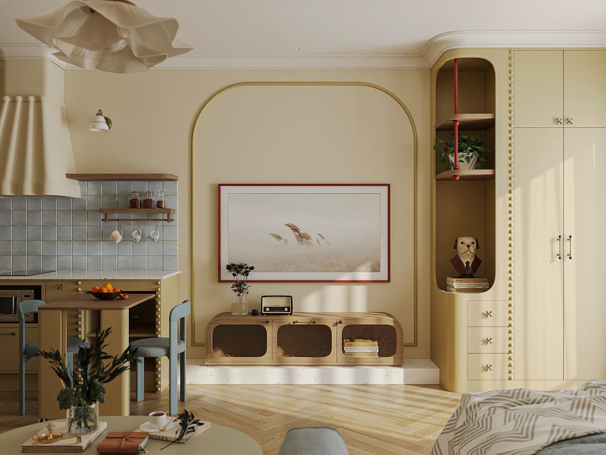 Tông màu chủ đạo của căn hộ là vàng bơ, phủ đồng nhất trên tường, hệ tủ bếp, tủ quần áo và kệ tivi.
