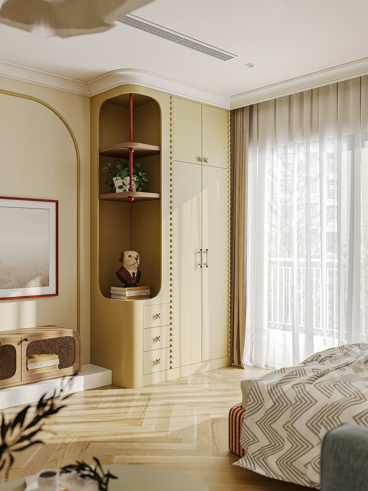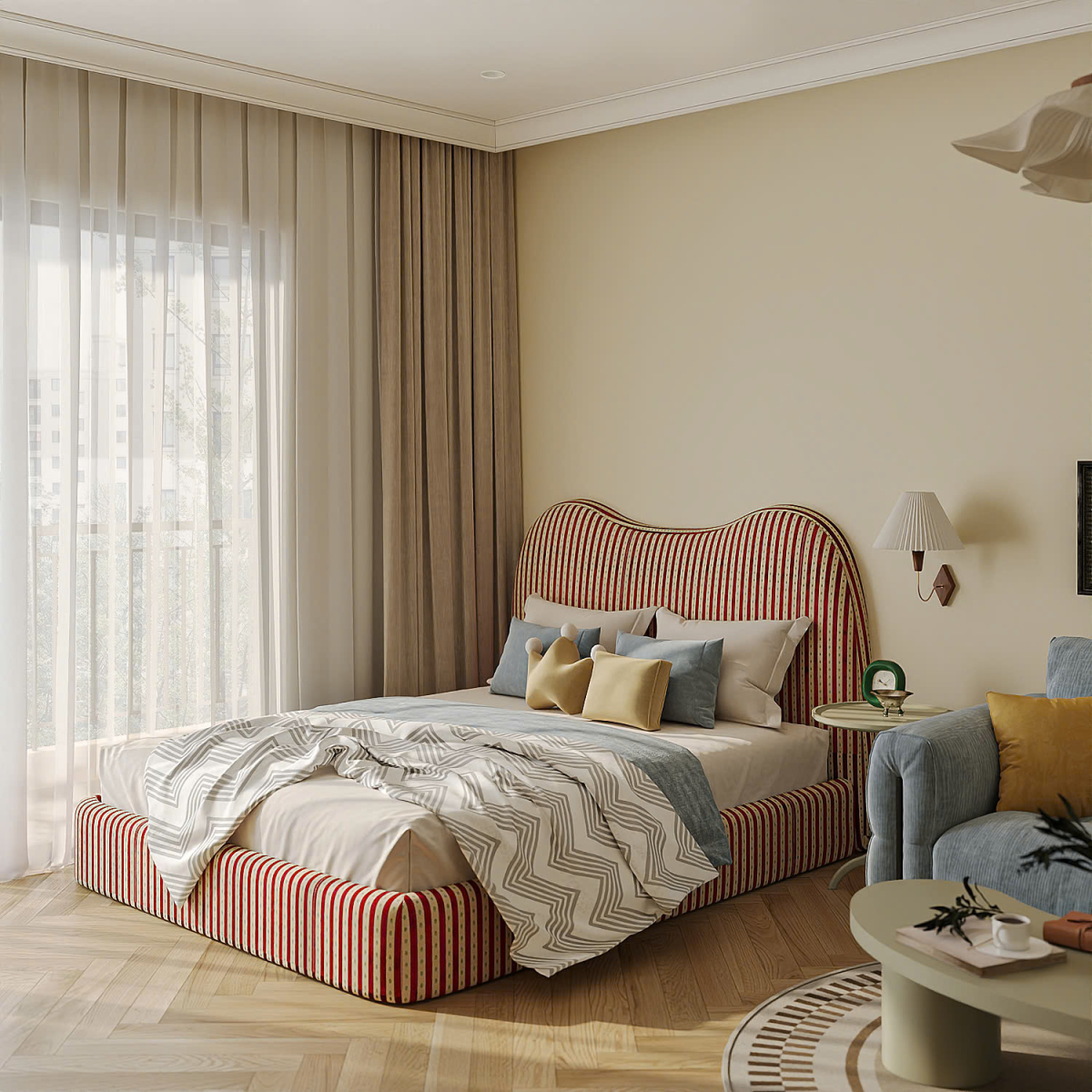 Giường ngủ có đầu giường bọc vải kẻ sọc đỏ - trắng, dáng cong mềm, kê sát cửa kính lớn.