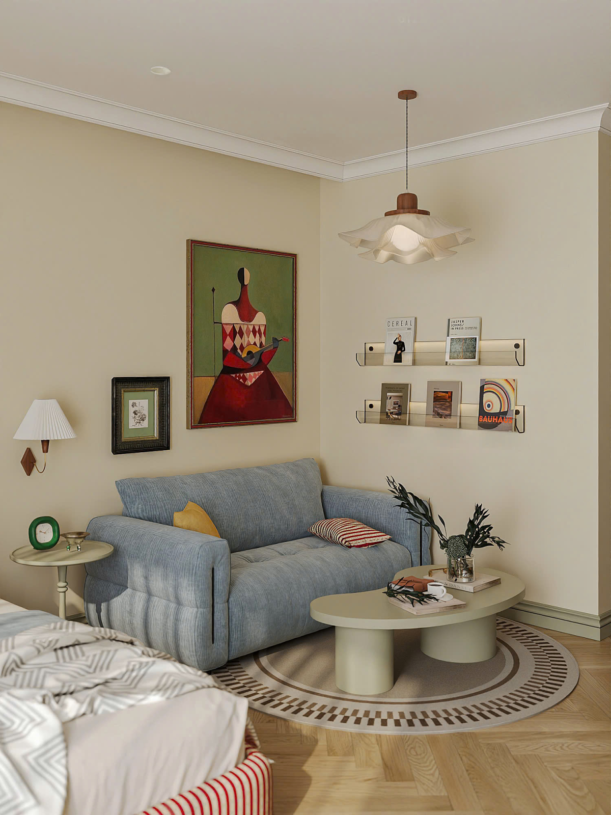 Ngay cạnh giường là sofa 2 chỗ bọc vải xanh, kết hợp bàn trà dáng cong chân trụ đặt trên thảm tròn họa tiết, tạo thành góc tiếp khách nhỏ gọn.