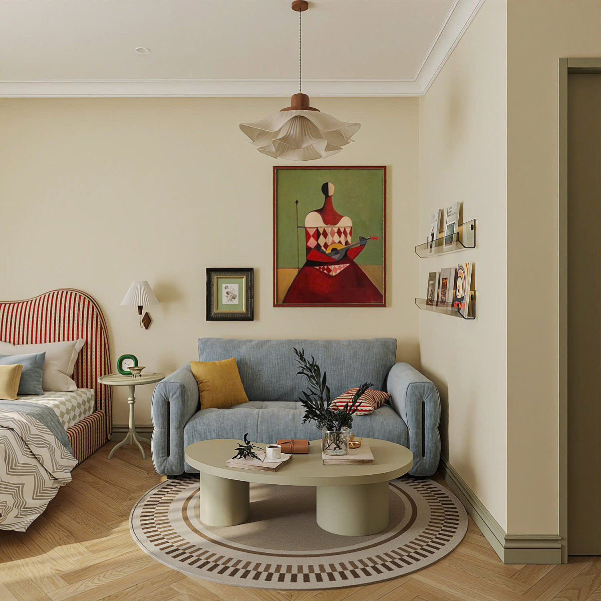 Tranh treo tường cỡ lớn với gam đỏ - xanh lá giữ vai trò điểm nhấn thị giác cho khu vực sinh hoạt chung. Hai kệ treo tường trong suốt bày sách, cùng đèn treo trần dáng hoa xếp nếp, hoàn thiện không khí retro cho toàn bộ căn hộ.