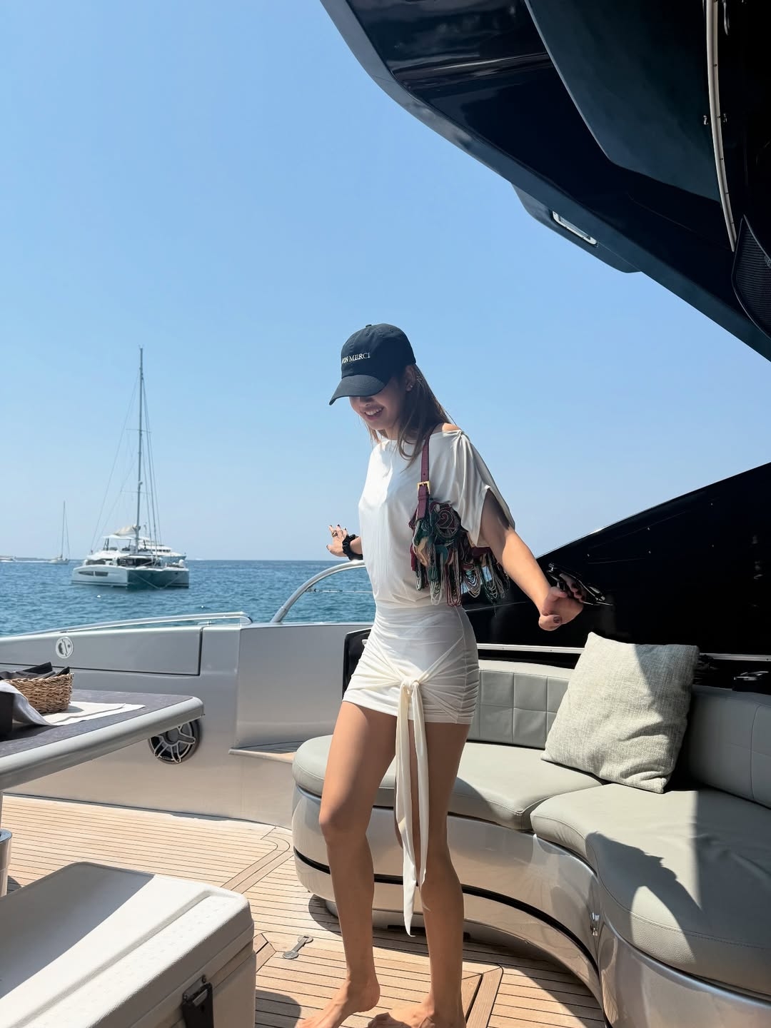 Trên du thuyền, cô chọn trang phục gọn gàng gồm quần shorts và áo phông để thuận tiện trong các hoạt động.