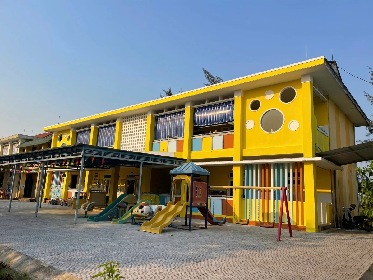 Trường mầm non Quang Thái, xã Đan Điền với 268 học sinh rực vàng trong màu áo mới dưới ánh nắng.