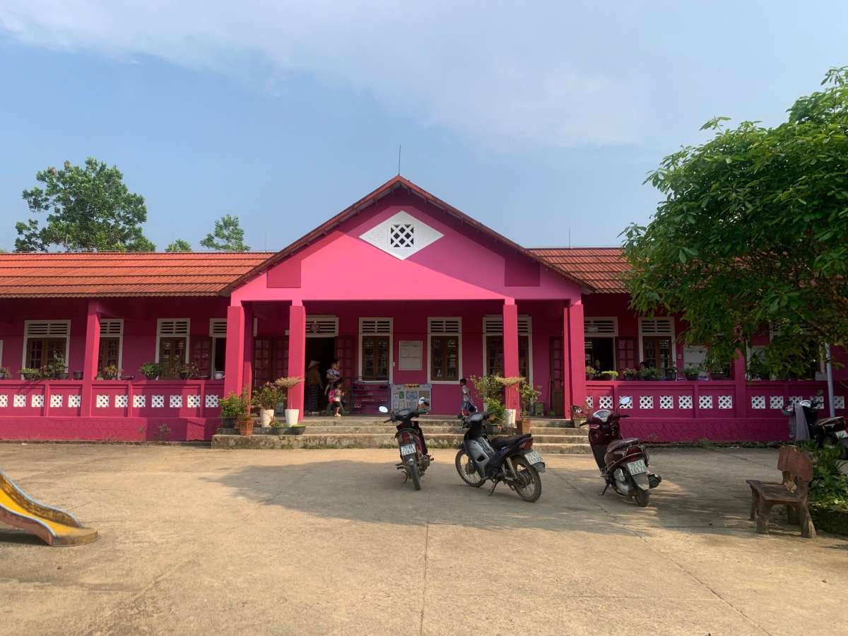 Trường Mầm non Hồng Thượng, xã A Lưới có hơn 50 học sinh. Cách đây vài tháng, lớp sơn hồng bạc màu loang nổ, nay "khoác lớp áo" hồng rực rợ, tạo niềm vui phấn khởi cho cả cô, trò và phụ huynh.