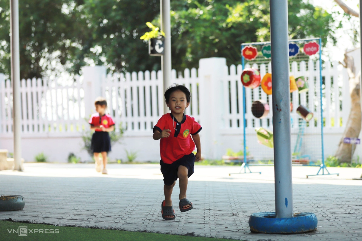 Các em học sinh trường mầm non Phú Lương thoải mái vui đùa trong khuôn viên trường mới được sơn sửa, nâng cấp.