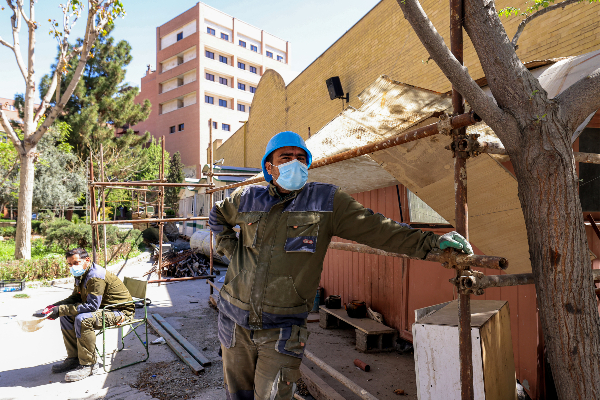 Một công nhân đứng cạnh giàn giáo gần khu vực bị không kích tại Đại học Công nghệ Sharif ở Tehran.