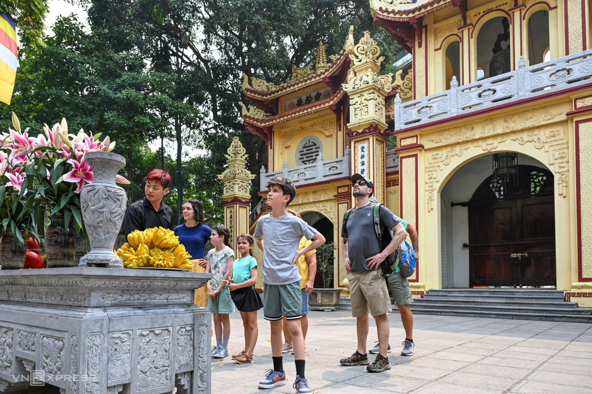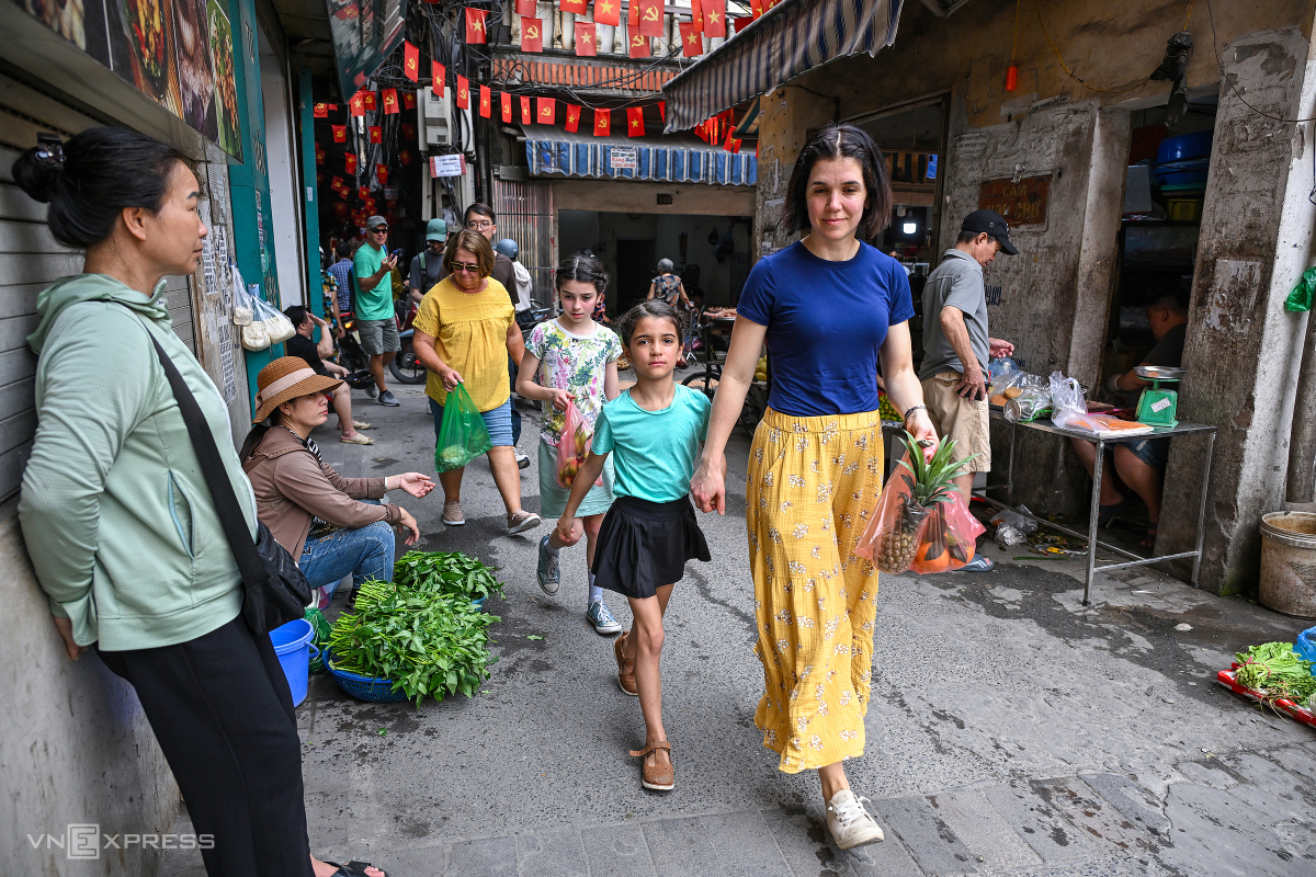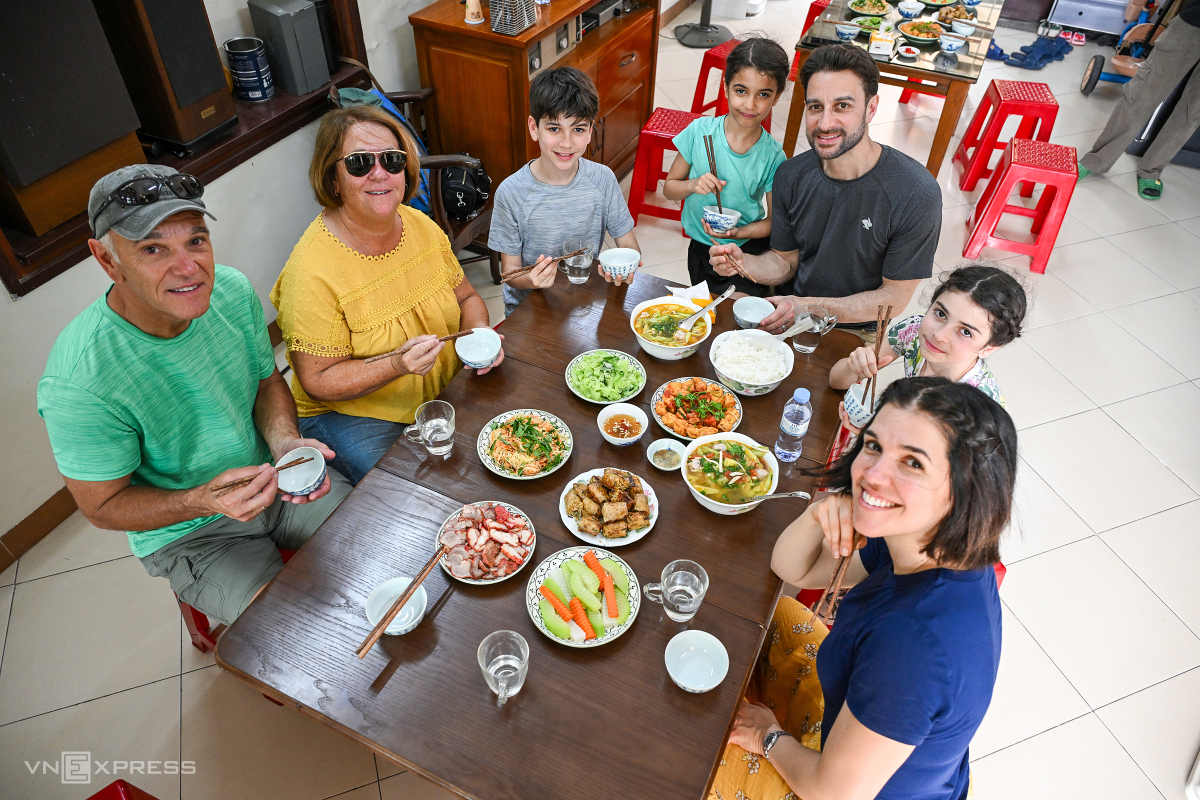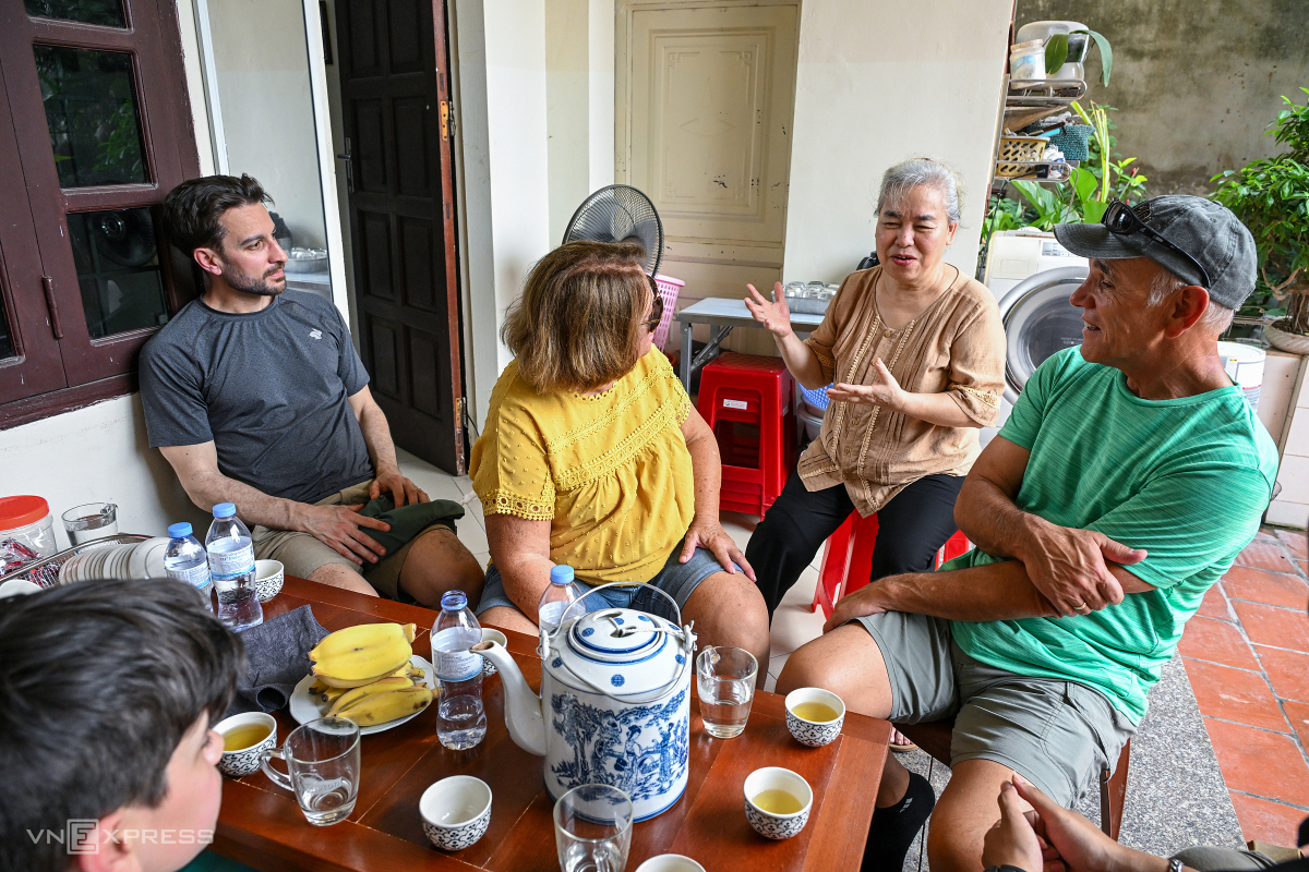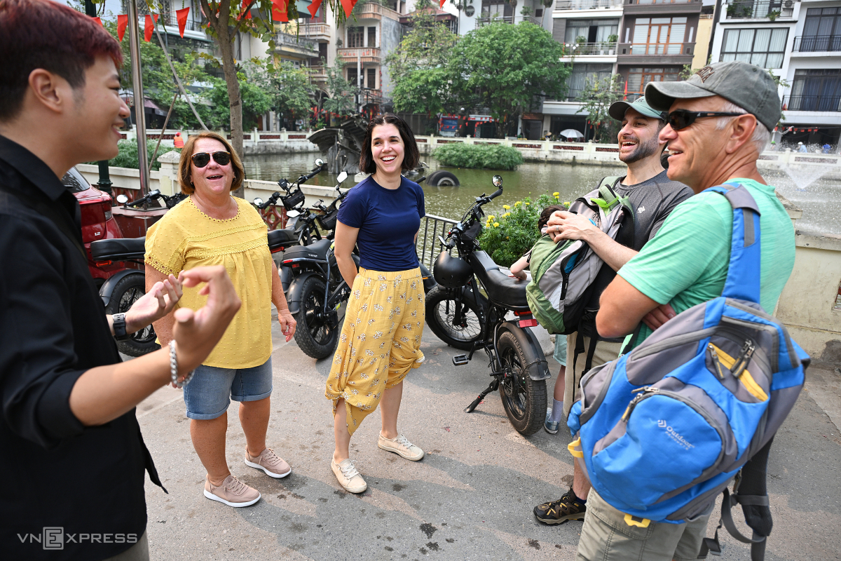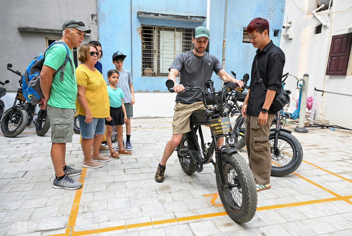 Gia đình Eric Legault (áo xám), du khách Mỹ, gồm 7 thành viên thuộc ba thế hệ đã dành nửa ngày khám phá Hà Nội bằng xe đạp trợ lực trong chuyến du lịch Việt Nam từ đầu tháng 3. Thay vì tham quan theo cách truyền thống, gia đình ông Eric chọn trải nghiệm chiều sâu qua việc luồn lách trong các ngõ nhỏ, đi chợ và dùng bữa cùng người dân địa phương.