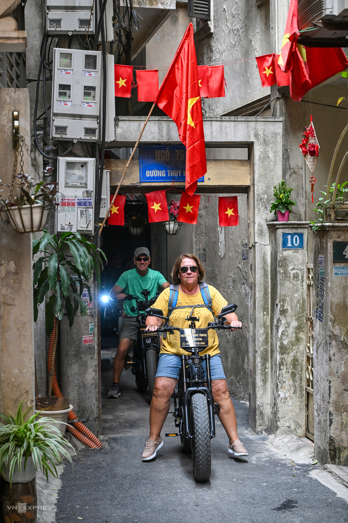 Phần sau của hành trình, họ học cách di chuyển như người Hà Nội khi luồn lách trong những con hẻm nhỏ, một số chỗ hẹp chỉ vừa cho một xe di chuyển.