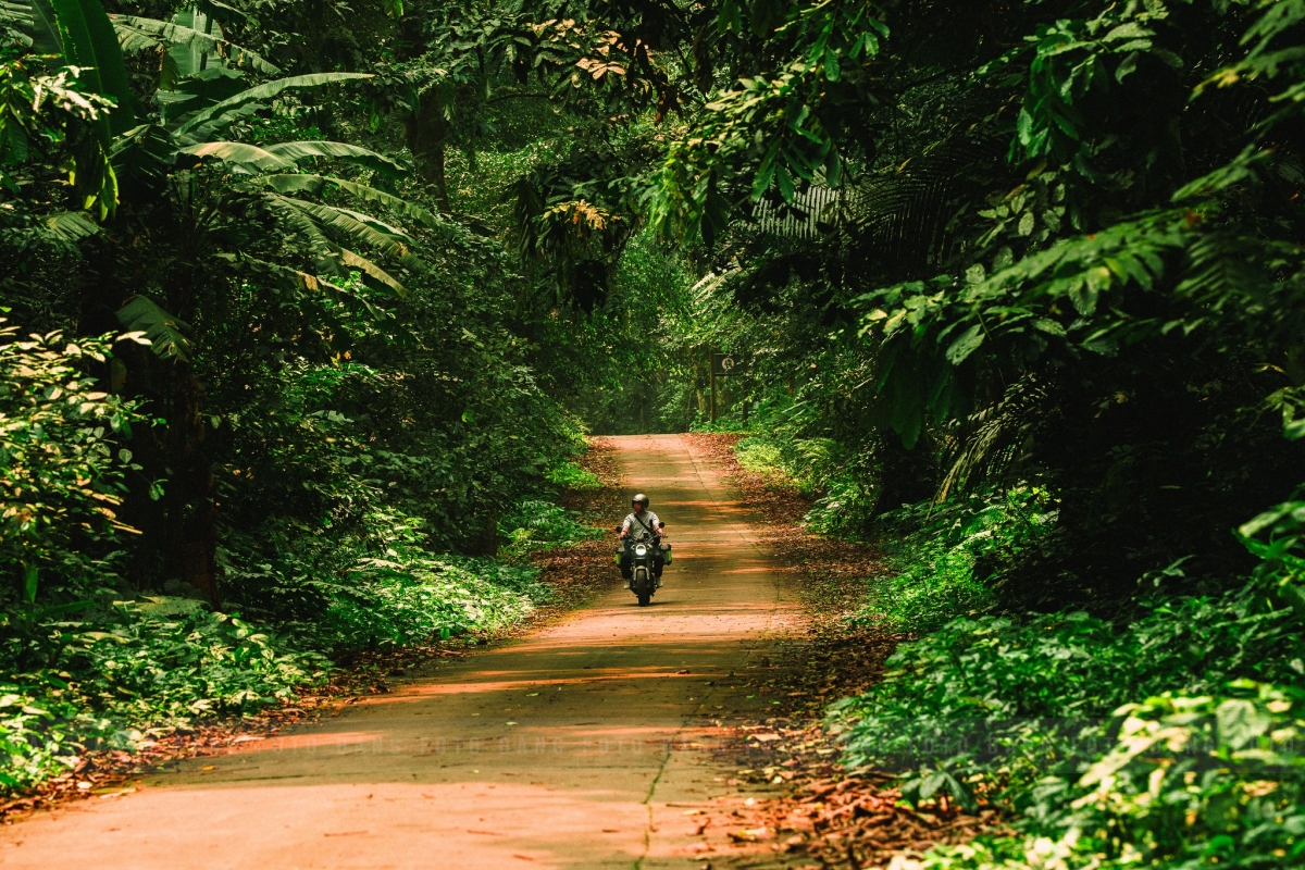 Con đường rợp bóng cây cổ thụ giữa lòng rừng nguyên sinh Cúc Phương. Để chủ động di chuyển trong rừng, du khách có thể thuê xe máy với giá 250.000 đồng mỗi xe.