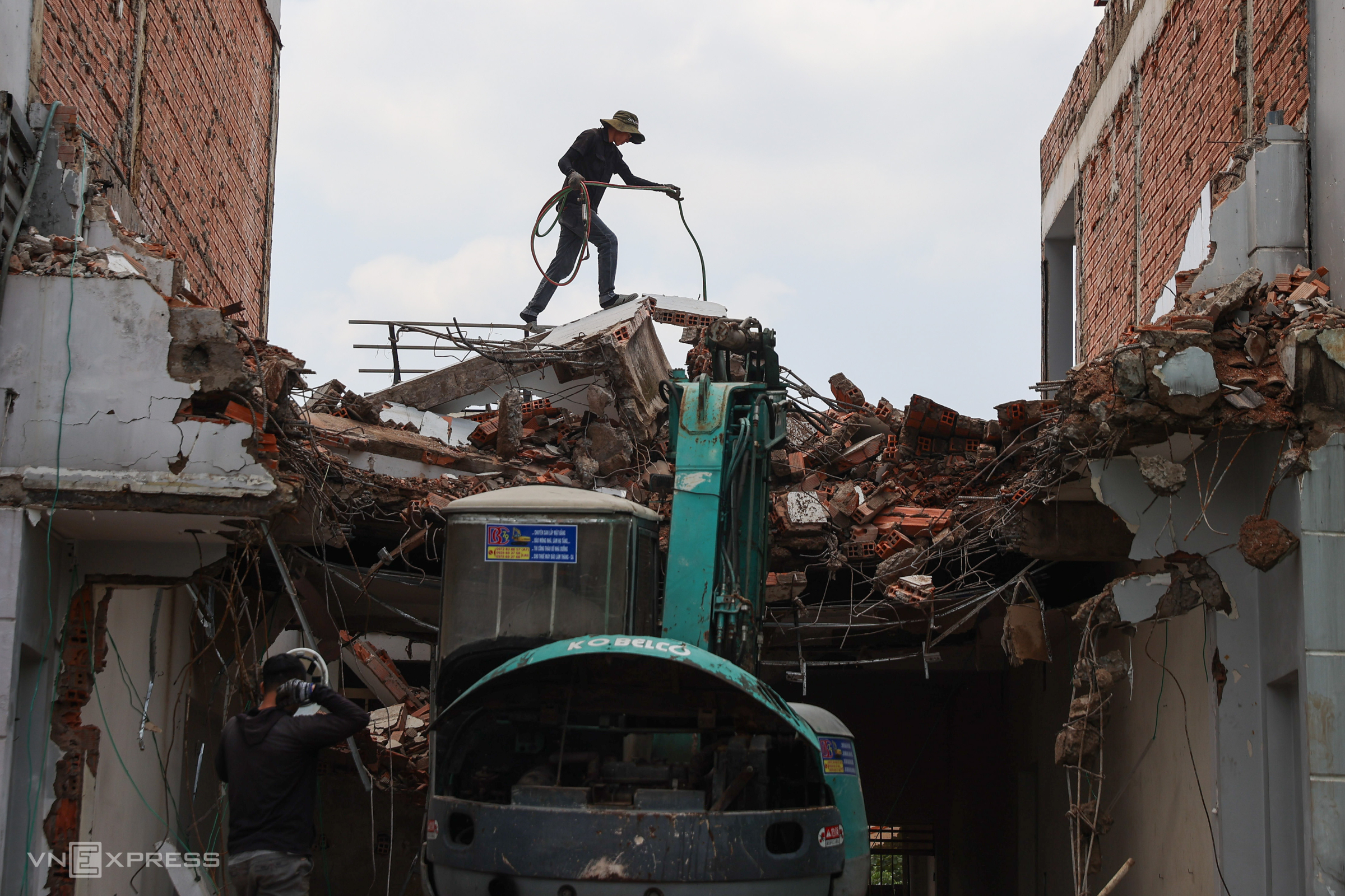 Các mảng tường sau khi kéo sập được công nhân cắt các kết cấu bên trong để lấy sắt thép.
