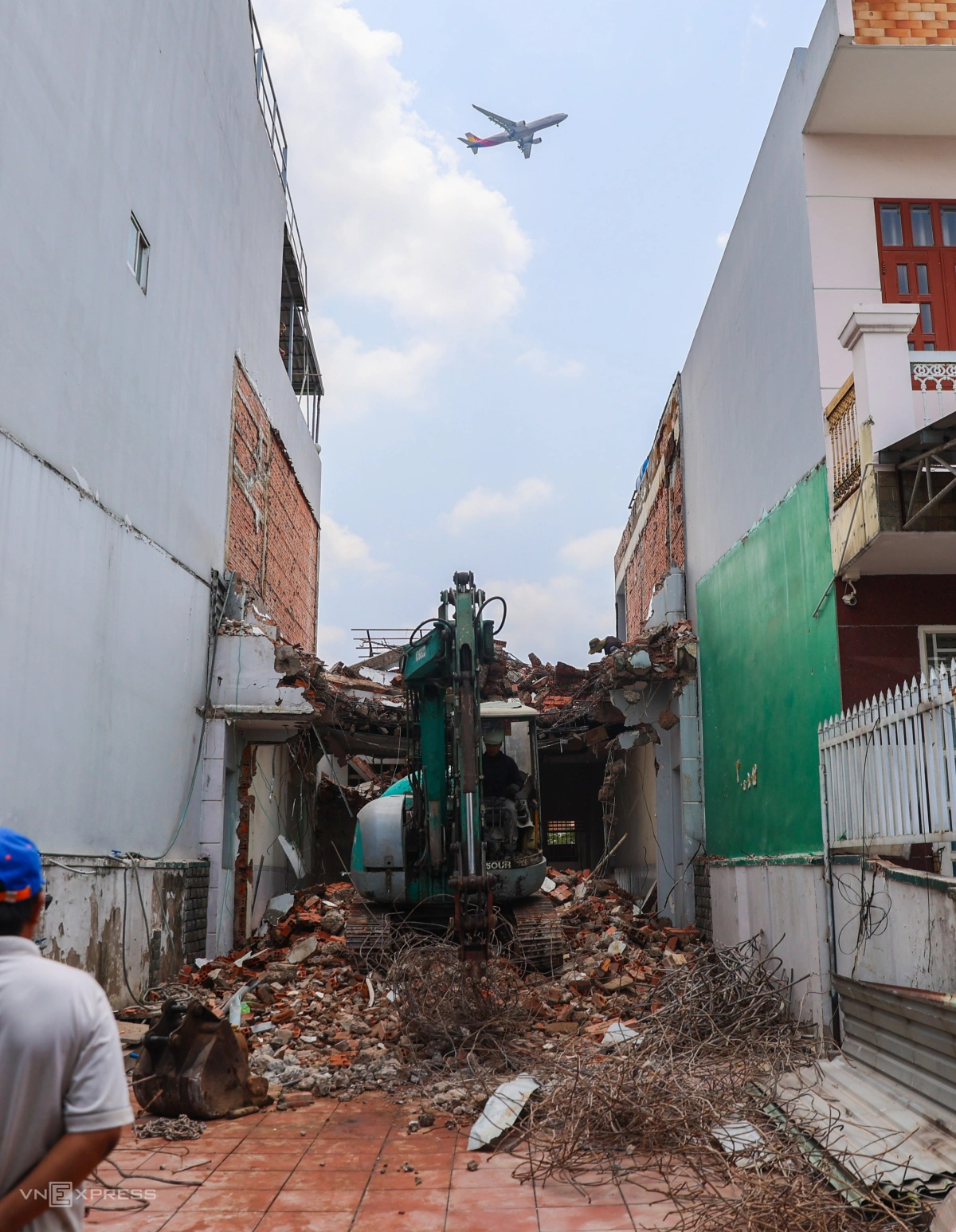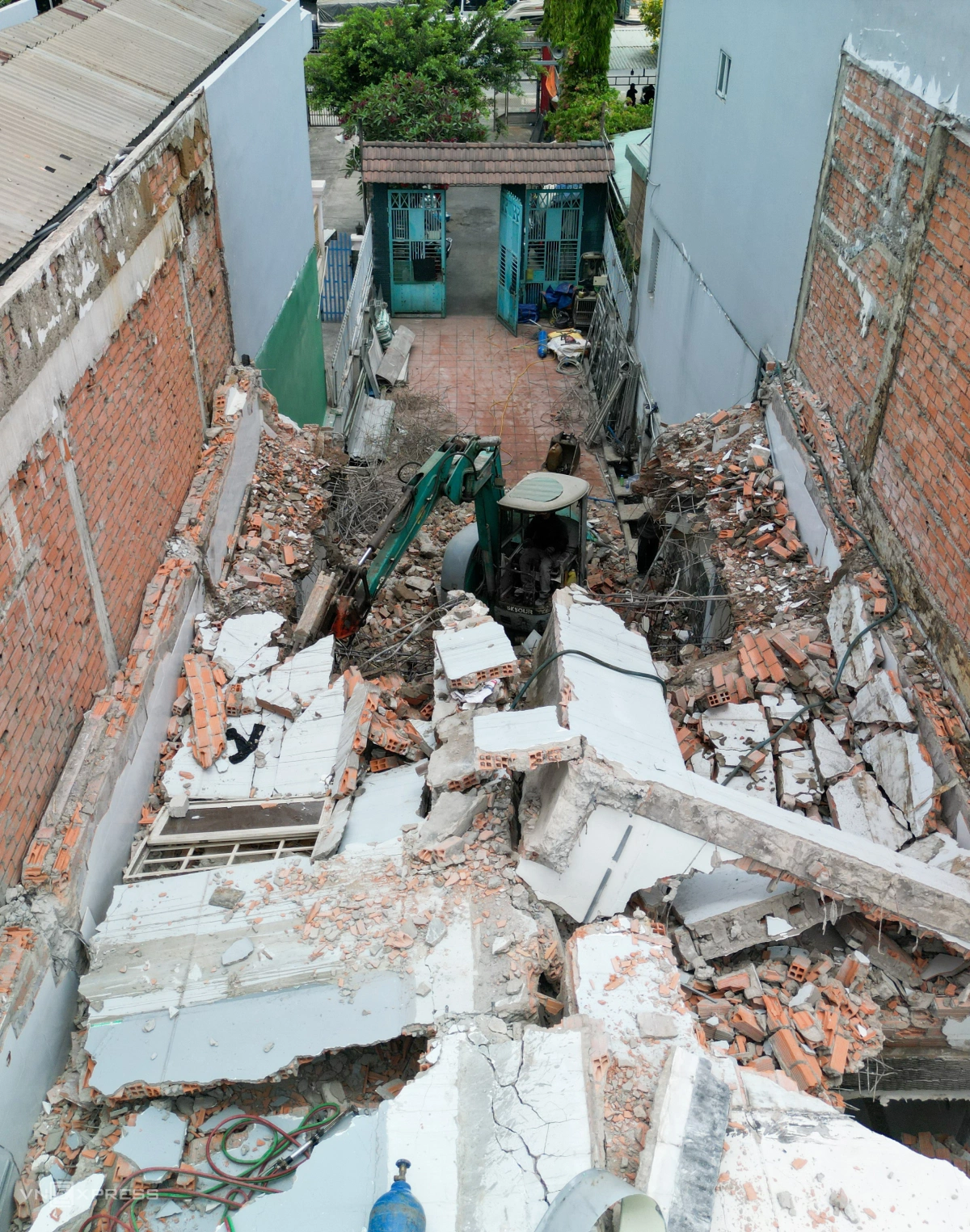 Tại căn nhà số 168, gạch đá, xà bần ngổn ngang sau khi tháo dỡ được công nhân thu dọn.