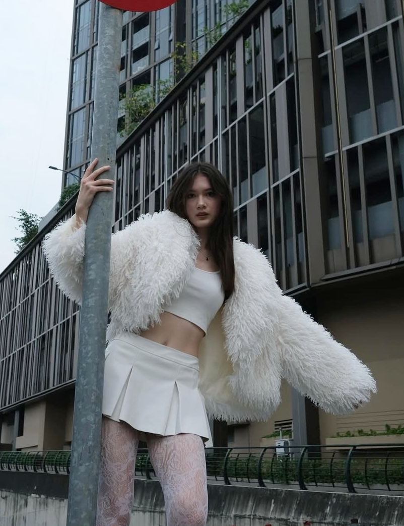Phong cách Y2K được cô thể hiện với crop top, chân váy xếp ly, áo khoác lông và quần ren trắng.
