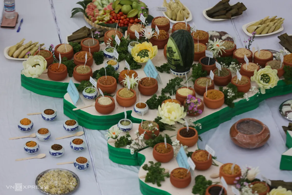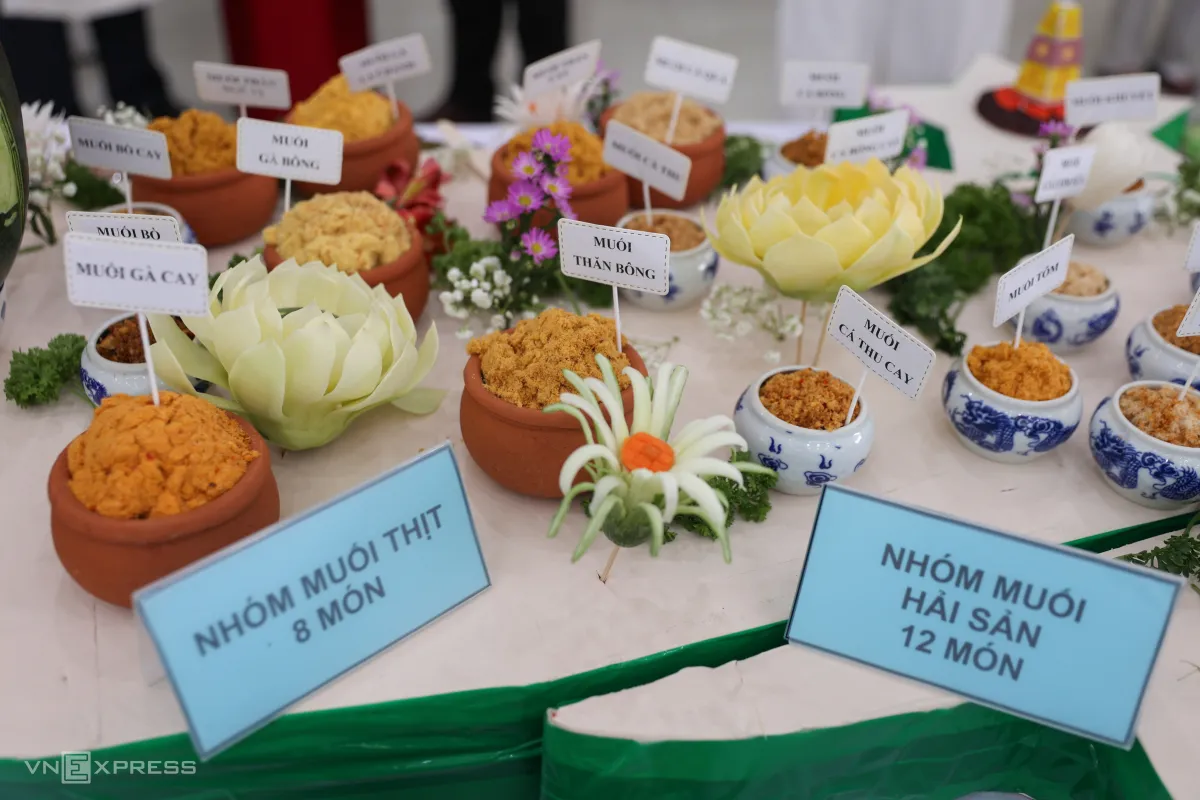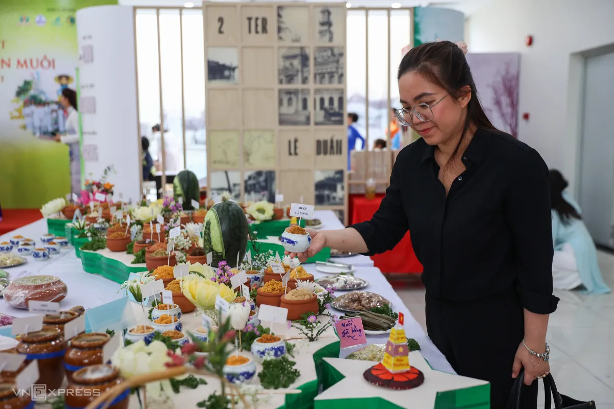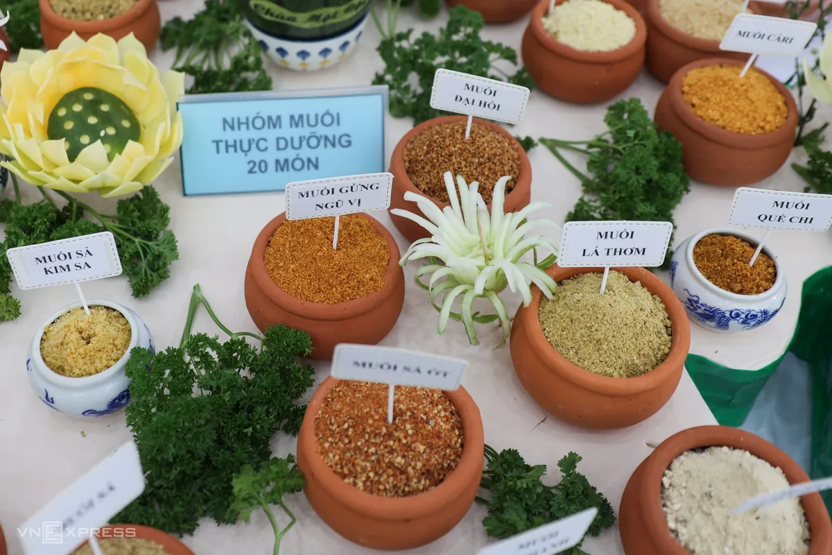 100 món muối truyền thống được trưng bày trên bàn, xếp thành hình bản đồ Việt Nam tại sảnh chính Trung tâm Lưu trữ Quốc gia II (phường Sài Gòn), do nghệ nhân Hồ Đắc Thiếu Anh cùng con gái Nguyễn Hồ Tiếu Anh thực hiện.