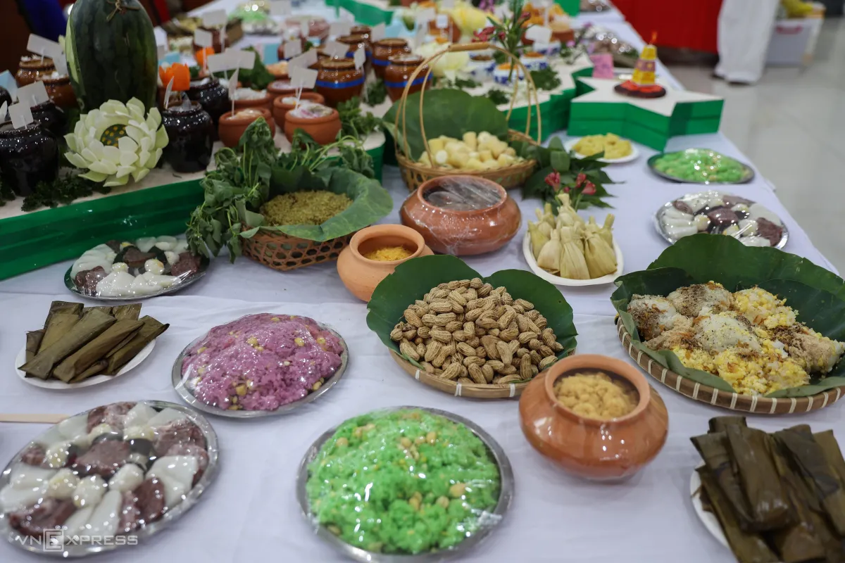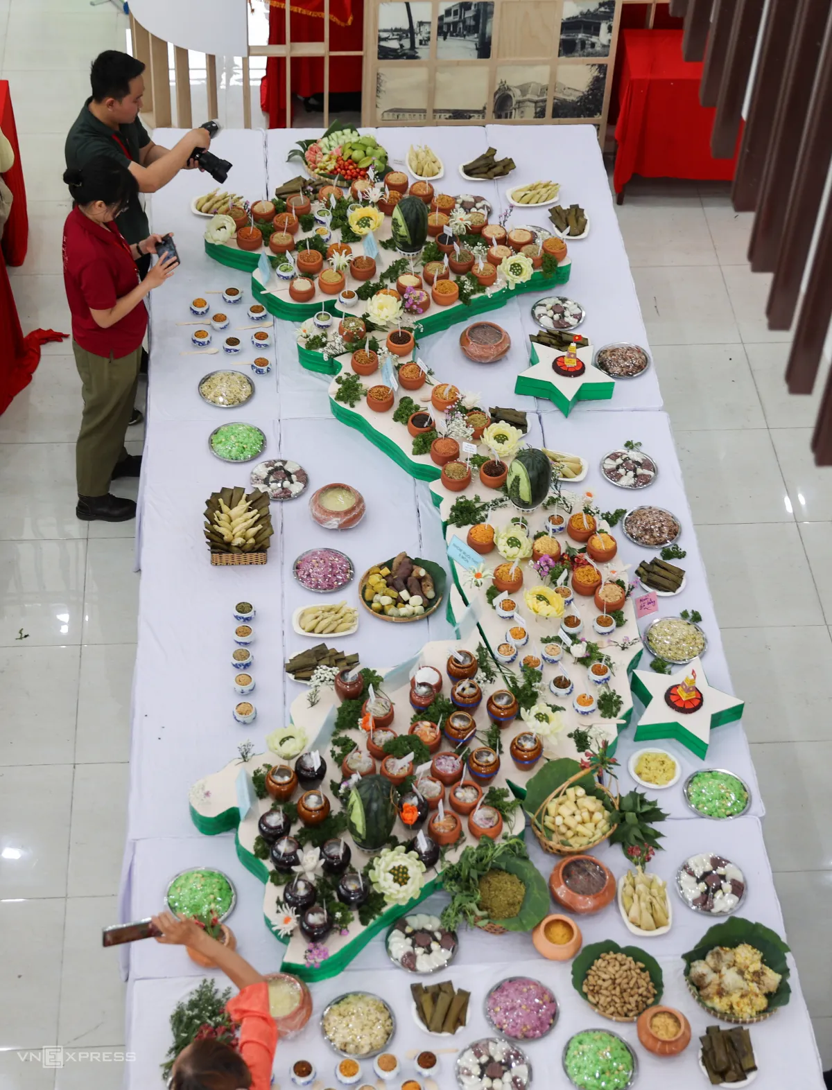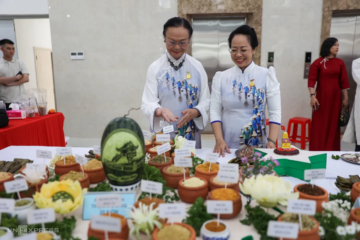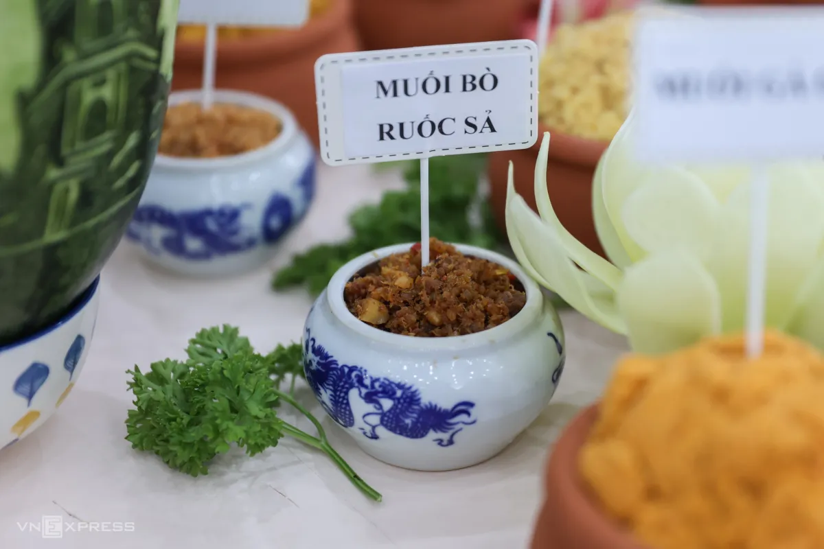 100 món muối truyền thống được trưng bày trên bàn, xếp thành hình bản đồ Việt Nam tại sảnh chính Trung tâm Lưu trữ Quốc gia II (phường Sài Gòn), do nghệ nhân Hồ Đắc Thiếu Anh cùng con gái Nguyễn Hồ Tiếu Anh thực hiện.