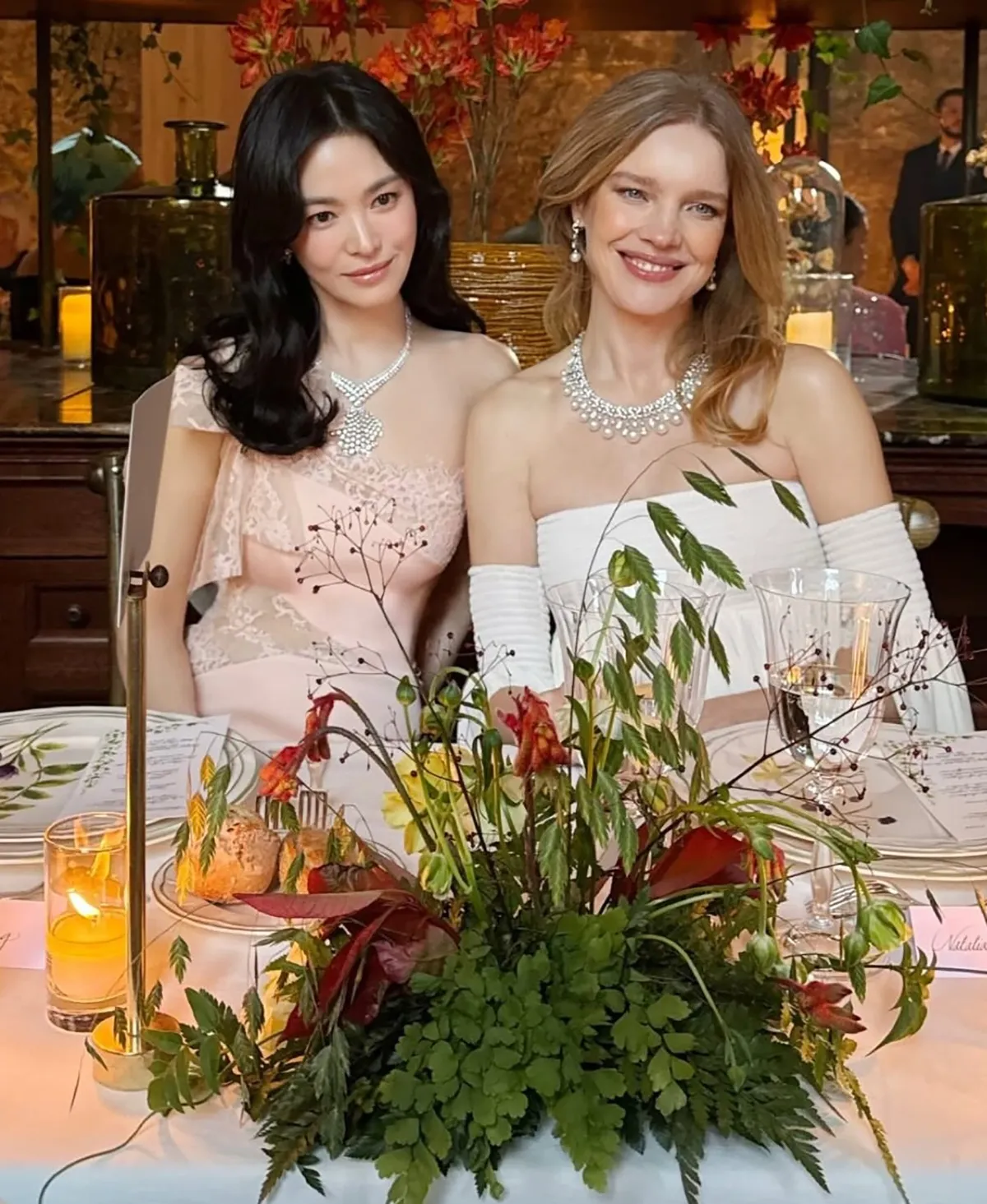 Theo Vogue HK, Song Hye Kyo (trái) và Lý Băng Băng chụp hình chung, hỏi thăm nhau khi làm khách mời lễ ra mắt một bộ sưu tập trang sức. Lý Băng Băng phát hiện Song Hye Kyo nói tiếng Trung lưu loát. Video: Weibo