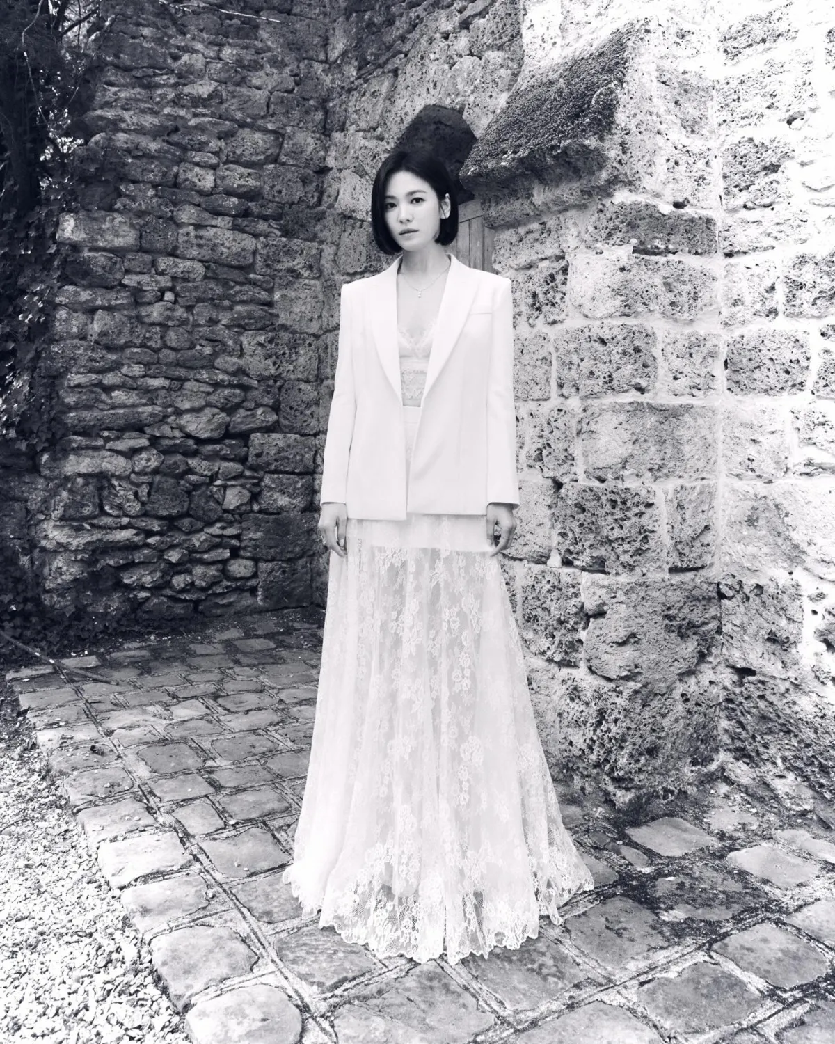 Song Hye Kyo thay trang phục chụp hình trong khuôn viên tổ chức sự kiện.